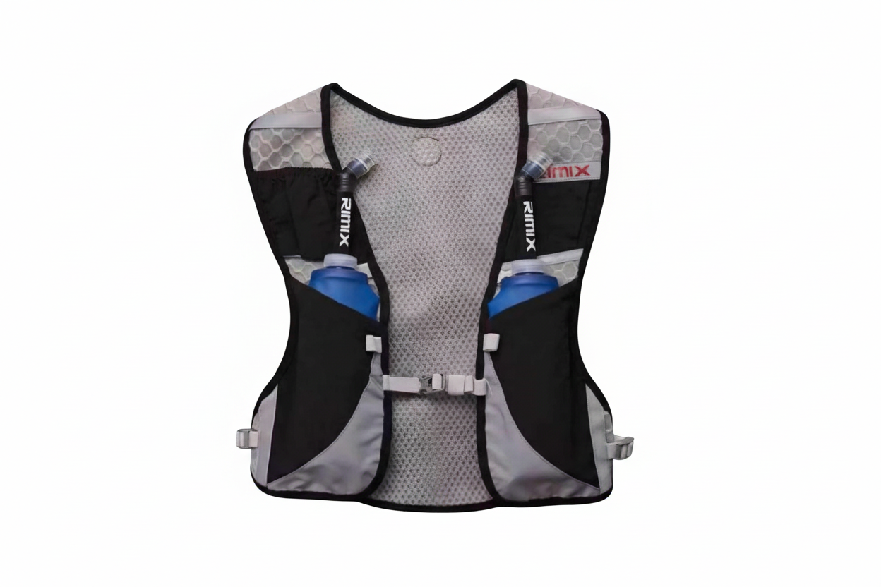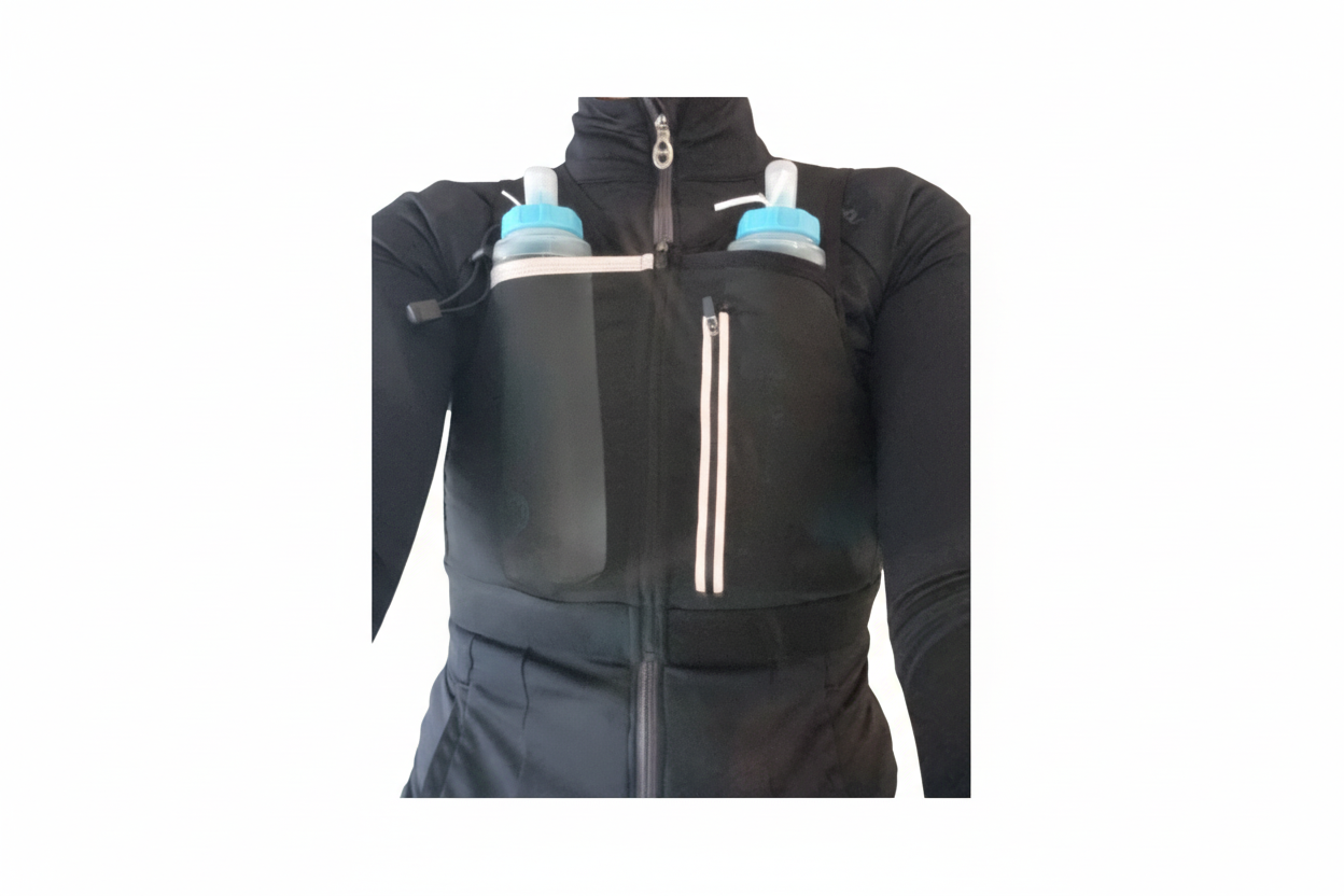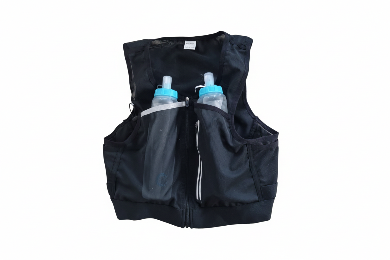 Erum með létt og þægileg vesti með plássi fyrir brúsann, símann og orkugel.