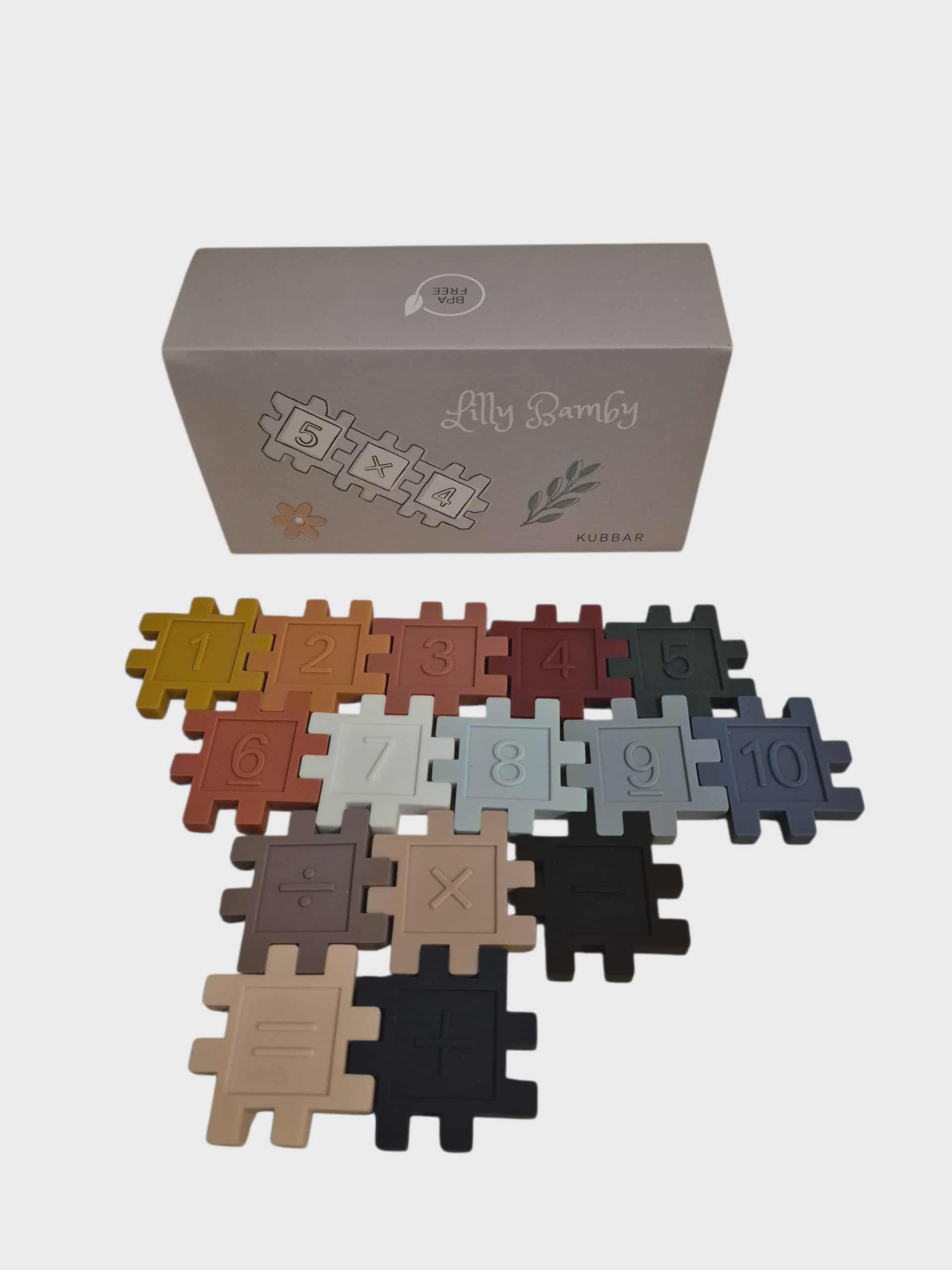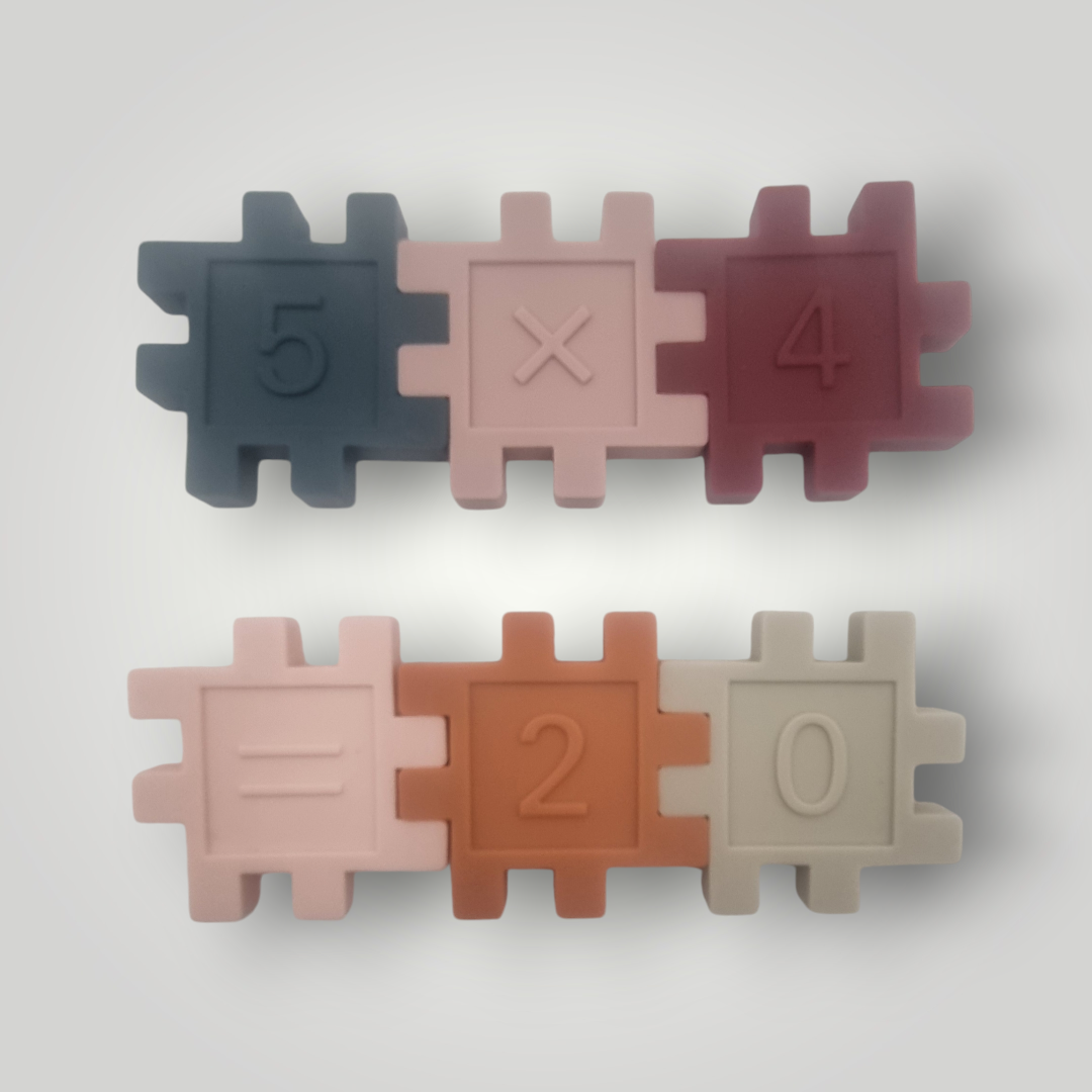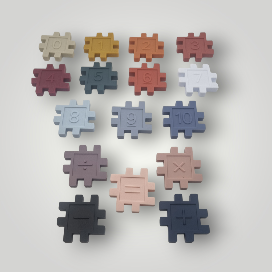 Kubbar úr silikoni, með tölustöfunum frá 1-9 á og táknin fyrir helstu reikniaðgerðir.