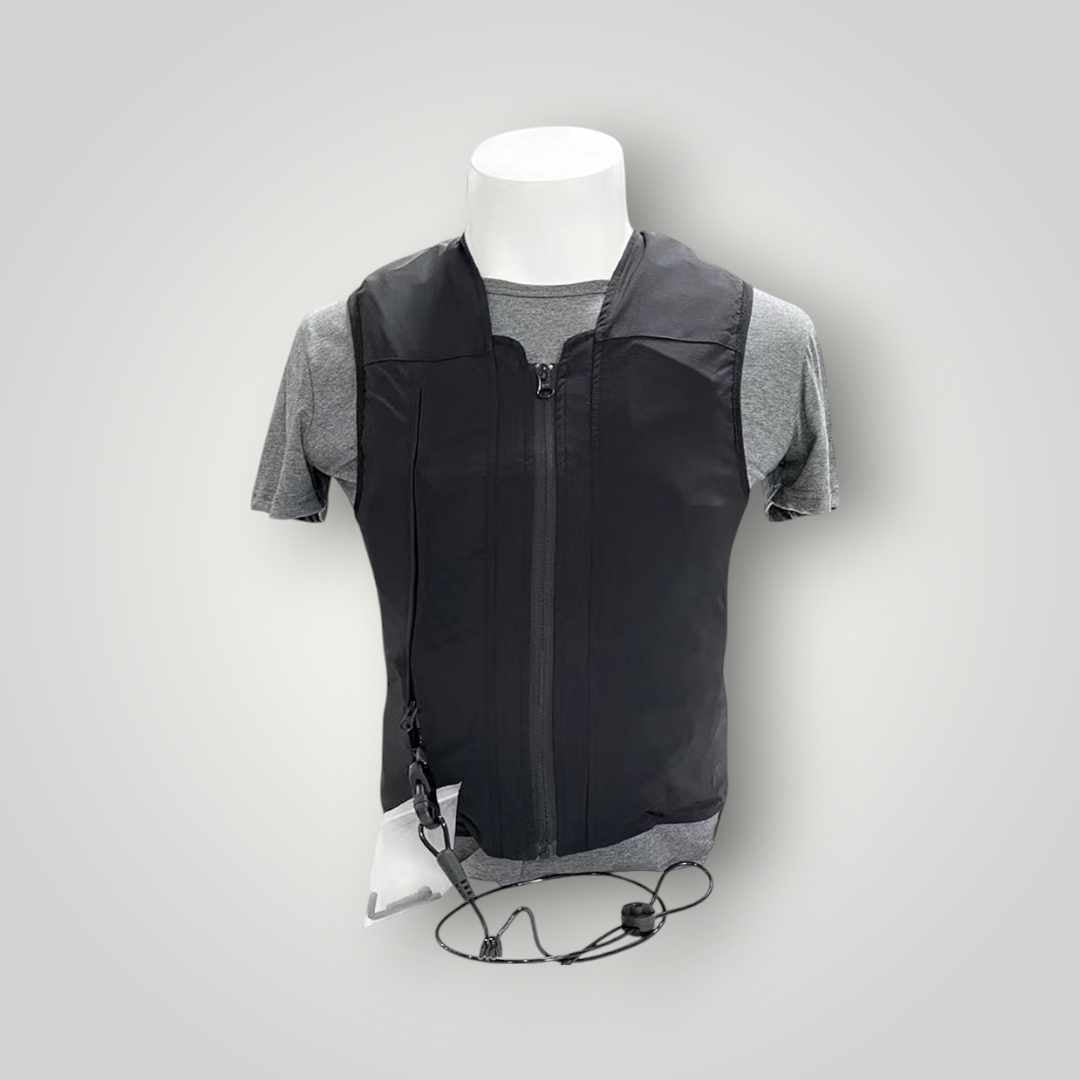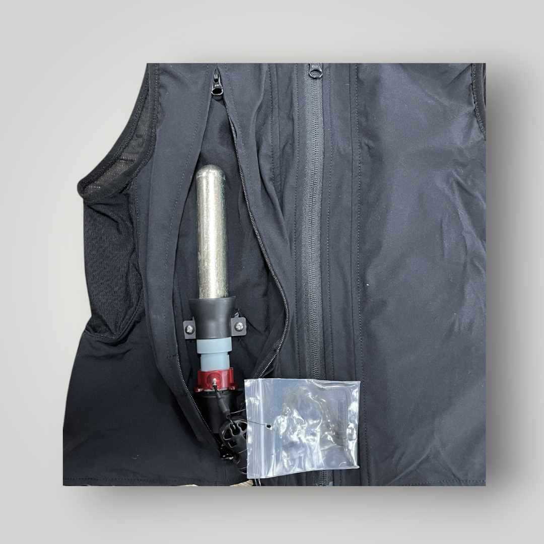 Vestið er með rennilás og innbyggðum loftpúða. Vestið er með gashylki sem springur út ef dottið er af baki.